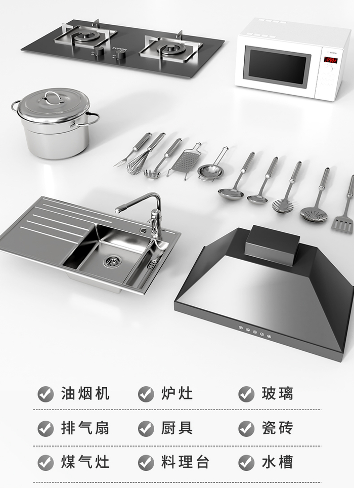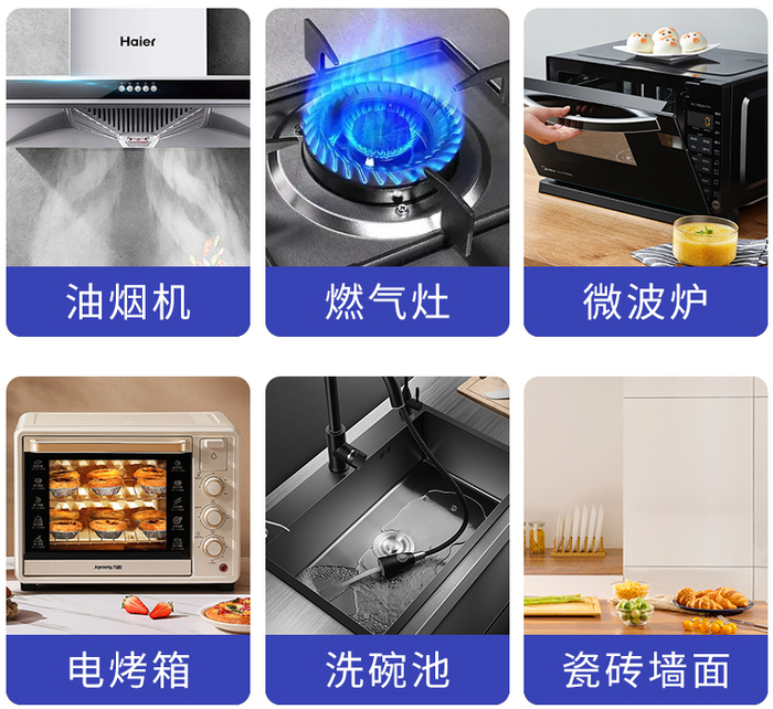 家里的油烟机、炉灶、玻璃、厨具等都能用它,不会腐蚀器具,放心用!