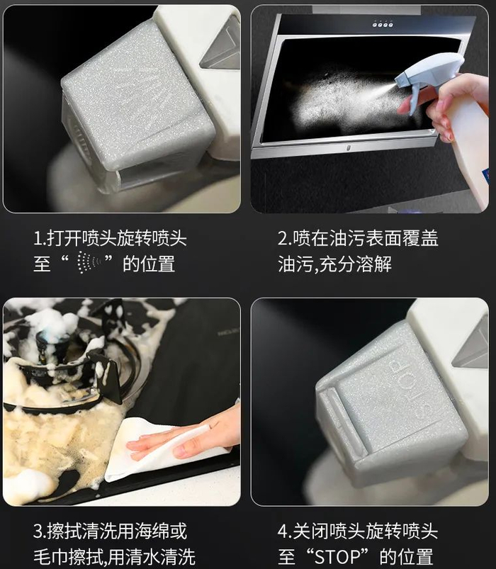 如果是小面积、局部清洁可以使用喷雾模式,精准乳化油污,快速清洁!