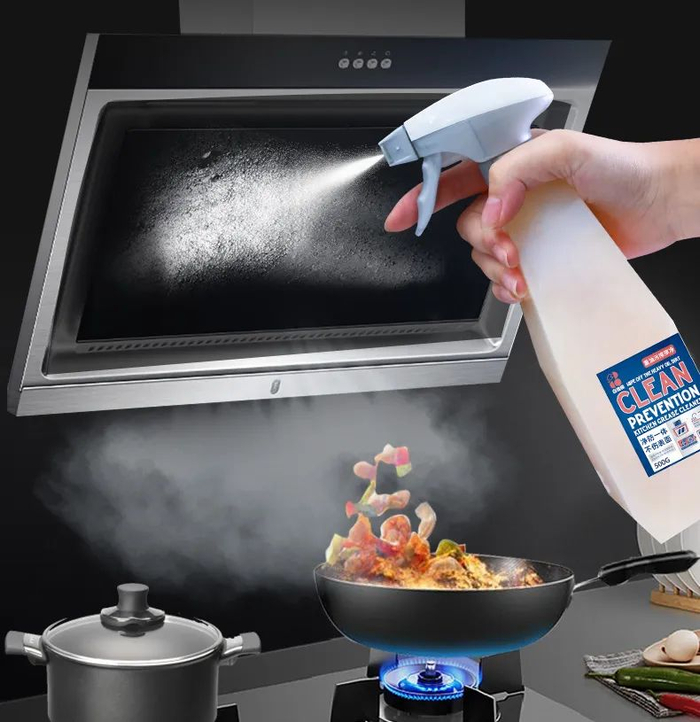 平时清洁完油烟机或者灶台后,可以在它的网罩或者油盒喷一层。