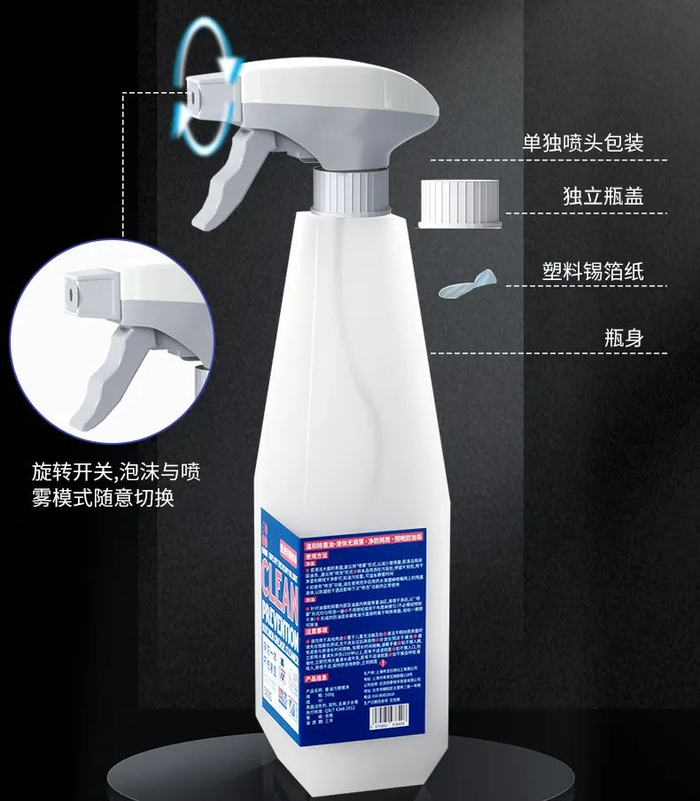 喷出来的泡沫不像水一样流动,而是附着在油污上,瓦解乳化油污,不滴不落!