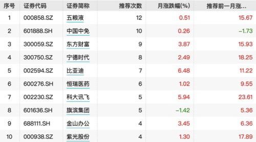 其中,宁德时代、五粮液、比亚迪、中国中免和东方财富也同时出现在了2月份的金股名单中,重合率50%。