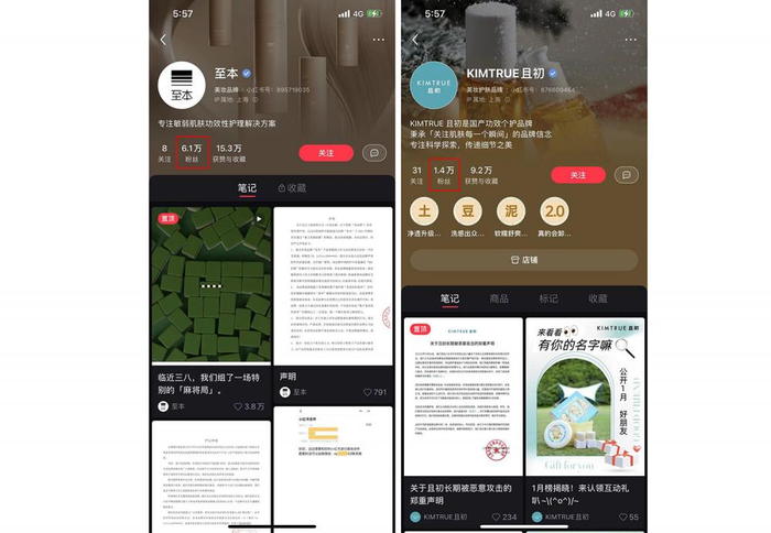 口碑营销崛起,小红书的测评,左右许多消费者的决策。至本和且初,在小红书的粉丝量,分别为6.1万、1.4万。