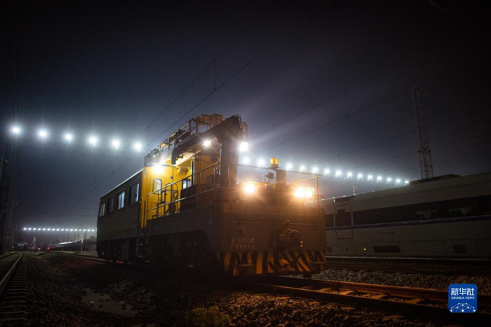1月31日晚,在武汉动车段,接触网检修作业车准备出库。铁路接触网供电设备是否正常运转,关系着每趟列车的安全运行。春运期间,中国铁路武汉局集团有限公司武汉供电段高铁接触网检修工人利用0点到6点的“天窗点”,头戴安全帽、身穿反光服,对京广高铁武汉段的接触网进行检修、维护,为高铁供电保驾护航。新华社记者 伍志尊 摄