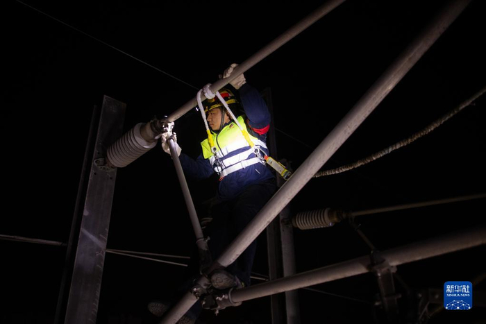 2月1日,接触网检修工人检修接触网设备。铁路接触网供电设备是否正常运转,关系着每趟列车的安全运行。春运期间,中国铁路武汉局集团有限公司武汉供电段高铁接触网检修工人利用0点到6点的“天窗点”,头戴安全帽、身穿反光服,对京广高铁武汉段的接触网进行检修、维护,为高铁供电保驾护航。新华社记者 伍志尊 摄