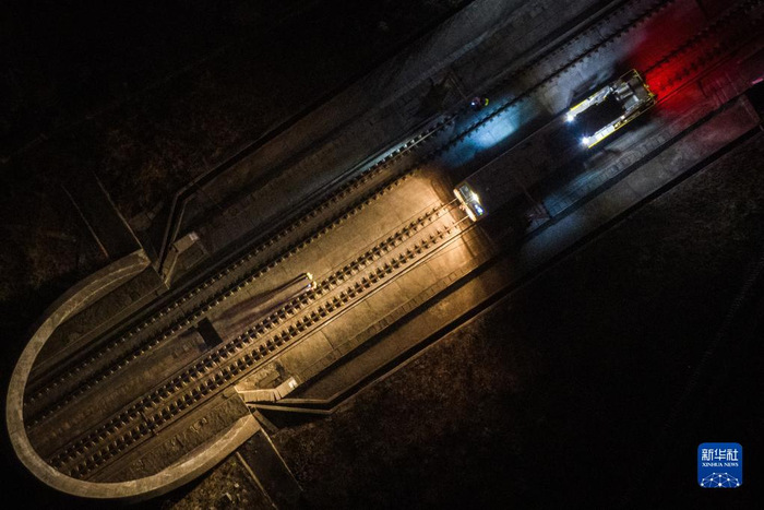 2月1日,接触网检修工人巡视隧道接触网设备(无人机照片)。铁路接触网供电设备是否正常运转,关系着每趟列车的安全运行。春运期间,中国铁路武汉局集团有限公司武汉供电段高铁接触网检修工人利用0点到6点的“天窗点”,头戴安全帽、身穿反光服,对京广高铁武汉段的接触网进行检修、维护,为高铁供电保驾护航。新华社记者 伍志尊 摄