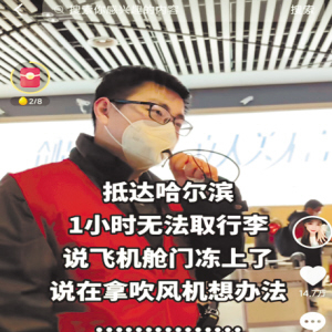 “当时我都蒙了,第一次听说飞机舱门还能被冻住。”抖音平台网友“Cindy爱自由”来自江苏,她告诉记者,她和朋友一行人1月23日大年初二17时许落地哈尔滨,下了飞机他们就去指定转盘等待行李。但等了一个多小时,不仅没等到行李,就连运送行李的转盘传送带也一动不动。“这个时候就有机场工作人员拿个大喇叭向我们解释称,飞机行李箱舱门被冻住,无法拿出行李。”“Cindy爱自由”称,当时机场工作人员也尽力在解决,称正在用暖风机吹门,尽快取行李。