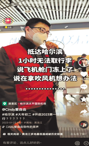 “当时觉得机舱门被冻住这件事很好笑,又觉得很意外,特别是现场都和和气气的,就随手拍了一段视频发在了抖音平台上,没想到火了。”“Cindy爱自由”告诉记者,事后她回忆,1月23日她所乘坐的飞机从上海起飞时,上海正在下雨,而哈尔滨温度过低,飞机舱门被冻上是可以理解的。“Cindy爱自由”告诉记者,“飞机舱门被冻住”的视频迅速“蹿红”,很多平台都在转发,视频在抖音平台上已经有将近1000万的浏览量,不仅获得了众多网友点赞、评论、收藏,还曾一度上了热搜、同城热榜。