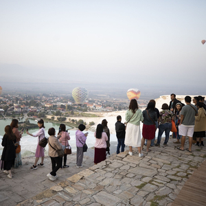 当地时间2022年10月19日,土耳其代尼兹利,游客在参观棉花堡。 视觉中国 图