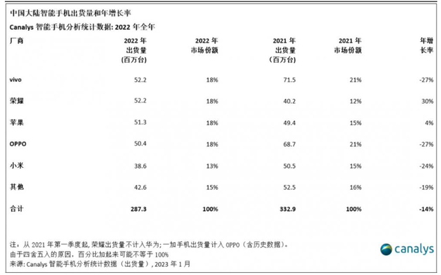 分解来看,冰火两重天。Canalys 数据显示,2022 年荣耀出货量增长 30%,至 5220 万台,中国市场占有率也从 2021 年的 12% 提升至 18%,排名第二仅次于 vivo。