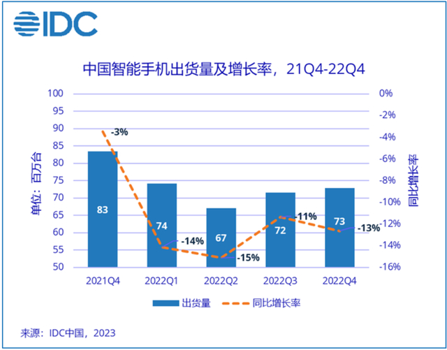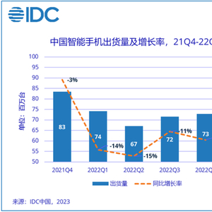 IDC 数据显示,2022 年四季度,中国智能手机出货量较去年同期下跌 12.6% 至 7292 万台,这已是连续四个季度录得两位数降幅。2022 全年,中国智能手机市场出货量仅为 2.86 亿台,同比下降 13.2%,创有史以来最大降幅,并是 10 年以来首次跌破 3 亿台。