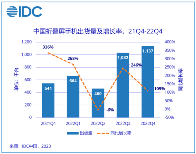 2022 年第四季度,中国折叠屏产品单季出货量再创新高,出货超过 110 万台。全年出货量近 330 万台,同比增长 118%,增速高于预期。只是,增速虽快,基数依旧很低。