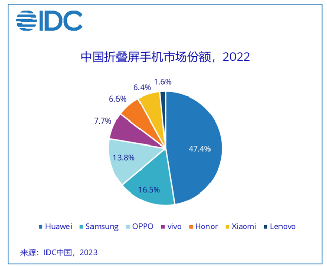折叠屏确然依旧小众,但可喜的是,折叠屏产品在国内智能机市场中占比从 2021 年的 0.5% 上升到 1.2%。其中,华为仍是牢牢占据国内折叠屏市场第一的位置,2022 年折叠屏市场份额为 47.4%,遥遥领先于其他厂商。