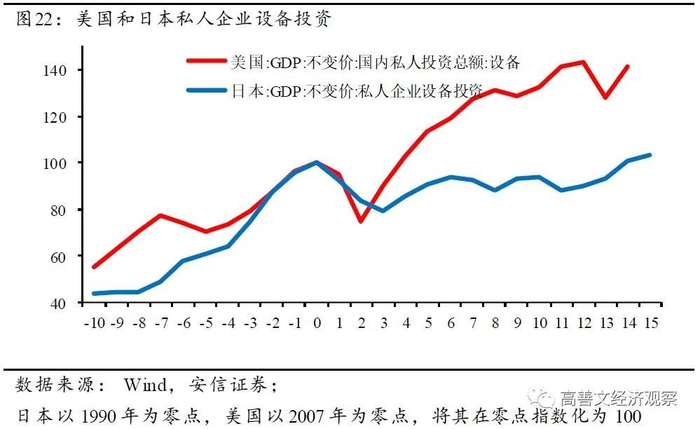 而观察图22中GDP分项当中企业的设备投资,作为流量的表征,美日同样存在显著的差异,美国的私人设备投资在危机后第三年恢复增长,并且随后十年间大体延续了此前十年增长的趋势线。而日本企业则始终修复缓慢,显著低于此前的趋势线水平,并且危机后十年内都没有超过危机前的高点。