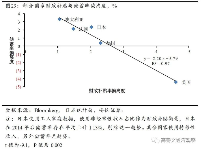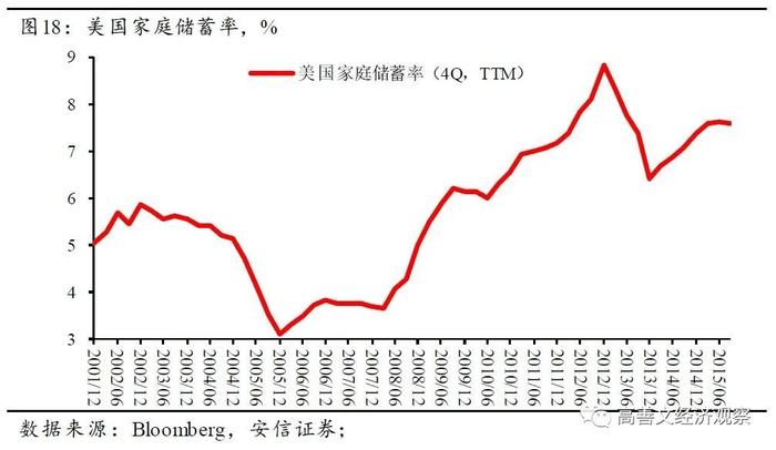 而美国居民的情况特征异常显著,在泡沫积累期,由于财富效应,居民储蓄显著低于正常水平。泡沫破灭后,储蓄率大幅上升,并且持续很长时间都没有回归到此前的正常水平。