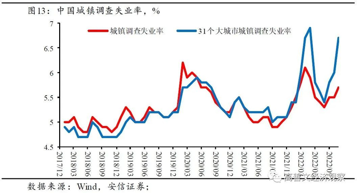 对比中国在2018年后的经济状态,一方面,根据人民银行2019年货币政策执行报告中的分析,当时产出缺口接近为零,而疫情后经济整体也很难认为处于过热状态。而观察失业率情况,如图13所示,也不能认为中国在2022年前失业率处于显著偏低的水平。在2022年前,中国经济并没有处于过热状态。