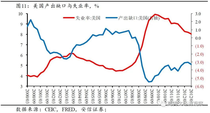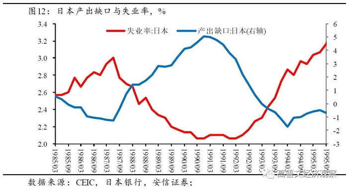 如下图11和12所示,在房地产泡沫前,无论从产出缺口抑或是失业率的角度,我们均可以观察到美国和日本经济在泡沫前夕处于过热状态。2004-2007年,美国失业率显著偏低,而产出缺口也是正向的。日本在1988年至1991年期间,同样也是失业率显著偏低,正向的产出缺口异常显著。