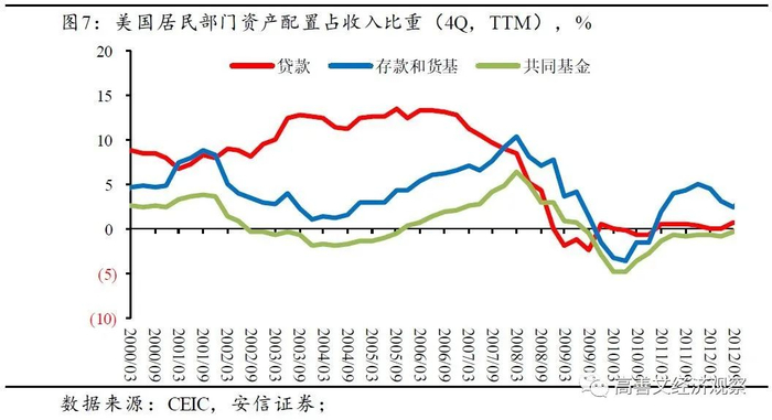 美国居民在金融危机前后现金流量表的变化也可以观察到类似的现象。如下图7所示,在2008年一季度后,美国居民同样出现减持贷款、广义存款和共同基金的行为,和日本泡沫破灭期间居民行为一样。