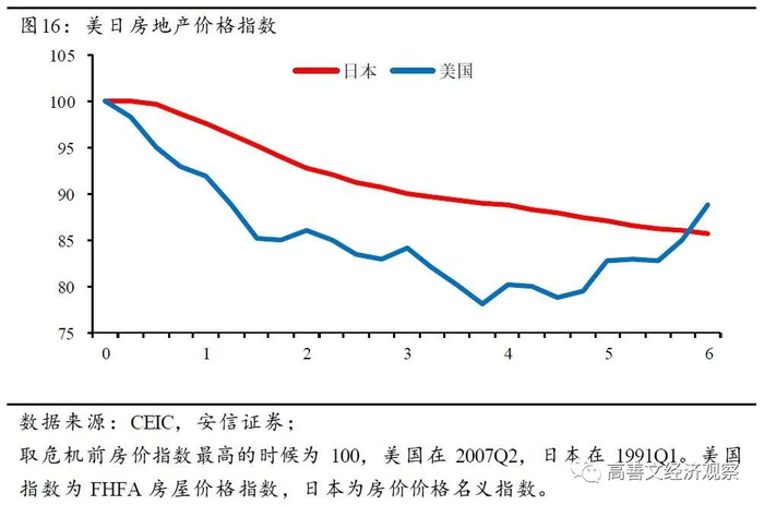 从居民资产负债表情况、资产价格情况和居民储蓄行为的对比来看,美国居民在危机中承受的伤害要大得多,但是“失去二十年”的是日本,美国尽管花了很长时间,但最终走出衰退,房价也在2016年超过2007年高峰。