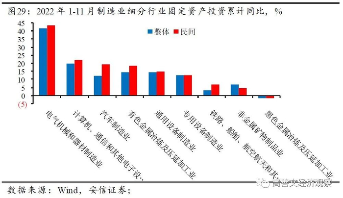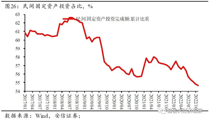 观察民间投资的占比,其下滑幅度相对有限,考虑到房地产这一回落最大的行业中民营企业占比更高,增长最快的基建投资中民企占比较小,这一回落并不高。