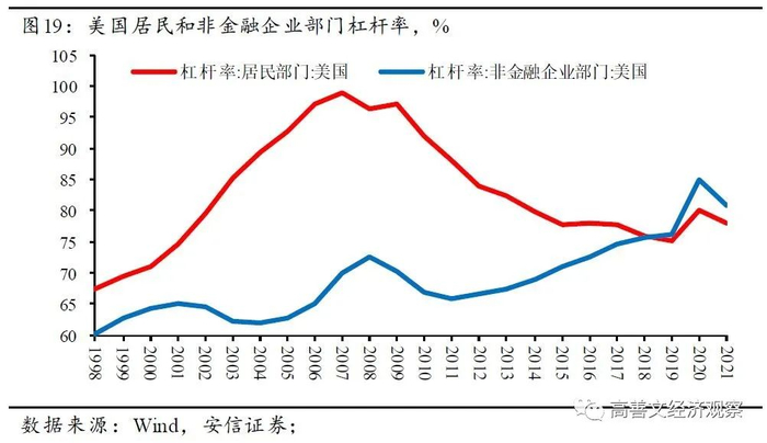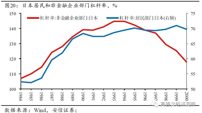 首先对比美日居民和非金融企业的杠杆率,如下图19和20所示,首先,和我们第一部分的讨论一致,美国居民在危机中受损更大,居民杠杆率下降超过20个百分点,持续时间超过10年,而日本居民杠杆率仅仅小幅下降两年,随后长期保持稳定。