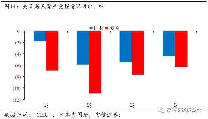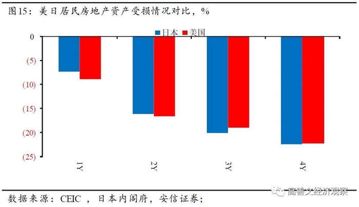 如图14和15所示,计算居民资产从最高点的跌幅,由于美国居民安全资产的配资比例更低,美国居民在整体资产上受损更大,尽管美日居民在房地产这一单项资产损失程度接近。