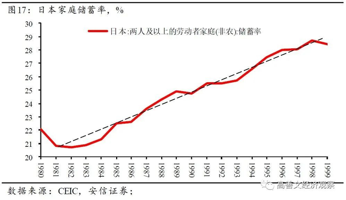 而观察美国和日本居民在危机前后储蓄率的变化情况,如下图17和18所示。对比发现,日本居民储蓄率的抬升在危机后的几年是不明显的,难以看出对80年代以来的上升趋势的背离。