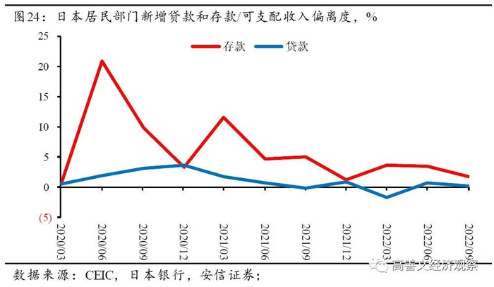 2021年四季度以来日本居民的行为可以部分提供参考,存款和贷款行为如图24所示。管控政策放松后,2021年四季度日本居民增持存款的行为较此前显著改善,但始终未能回到趋势水平以下。贷款方面则变化相对不大,同样在2021年四季度和2022年二季度环比提升,总体上可以认为居民的风险偏好小幅改善。