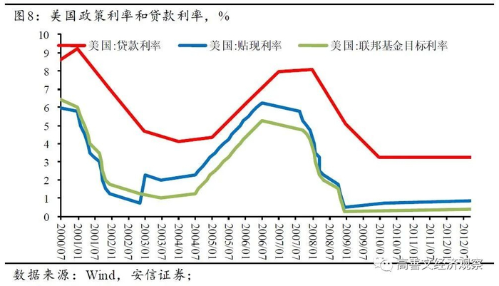 差异存在于2006年至2007年这一段时间,可以观察到贷款少增、存款和货基多增的现象。从表面上看,这和中国当下情况接近,但实质是完全不同的。美国居民这一行为的背景是加息进程开启,金融收紧,居民的融资可得性下降,进而导致贷款下降。与此同时,加息导致资金利率迅速上行,货币基金的吸引力大增,居民进行增持。