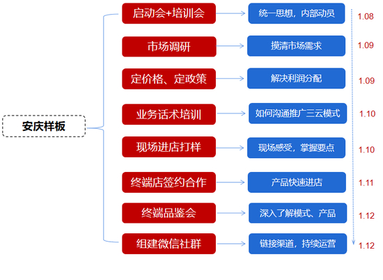 军辉三云安庆导入阶段临近春节,项目组克服不利因素,快速动员、加速推进,初步完成组织、训战、运营、内容、动员等工作,并制定了标准化流程,培训动员后团队有士气、终端有信心,渠道网点开发顺畅、市场渠道层面获得了广泛的认可,走通了三云模式,为军辉三云全国快速复制100个城市做好了基础工作。