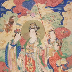 大功德天即吉祥天女,是佛教护法神,也是财富女神,为鬼子母之女、多闻天王之妻(一说为妹)。此图所画神女形象端庄宁静,后妃装扮,手拈宝珠。三侍女侍立其后,另有一力士手持香炉,神态皆虔诚肃穆。头顶有一白象乘五色祥云而来,象鼻卷宝瓶,散出各种宝物。上有金笔榜题:“大功德尊天”。此图技法极精湛,人物手、脸勾线细而有力,色调柔和雅致。衣纹多采用游丝描、钉头鼠尾描,用笔劲健流畅,富有动感。