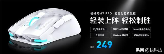 在GM8.0黑曼巴微动加持下,拥有8000万次超长寿命。并且还内置1000毫安锂电池,支持无线/蓝牙/有线三模连接,还可以通过机械师智能驱动轻松自定义专属于你的电竞鼠标,售价249元。