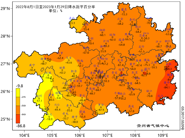 贵州省2022年8月1日至2023年1月29日降水量及距平百分率分布