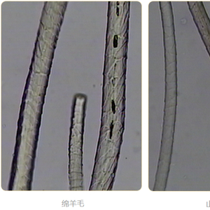 由于羊绒、羊毛同为动物纤维,很多化学性质一样,因此目前主要鉴别方法还是在显微镜下依据鳞片特性来区别。绵羊毛鳞片厚、向外翘,条干边缘呈锯齿形;山羊绒鳞片边缘光滑,类似环状包覆于毛干,鳞片薄,鳞片间距大,近毛尖部分的鳞片边缘呈锯齿形。