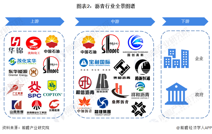 中国沥青产业链上游主要有华锦股份、沈阳化工、茂化实华等石油化工企业,以及山西焦煤、陕西煤业、云煤能源等煤炭企业;沥青产业链的中游主要为中国石油、中国石化、宝利国际、国创高新等沥青生产企业;沥青产业链的下游主要是建筑行业、道路交通行业相关的企事业单位。