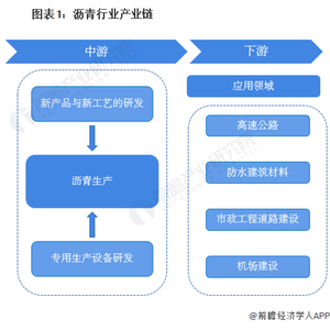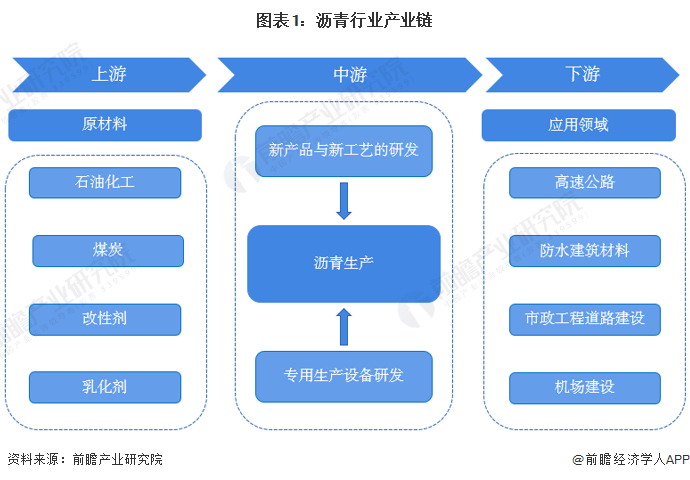 沥青行业上游为石油化工、煤炭和改性剂及乳化剂,下游为高速公路、防水建筑材料、机场建设和市政工程道路建设等。