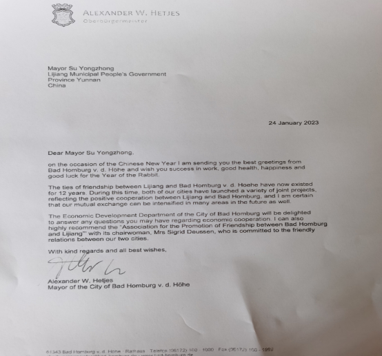 德国巴特洪堡市亚历山大市长在来信中说,值此中国农历兔年新年之际,祝丽江市人民身体健康、阖家幸福、事业有成。