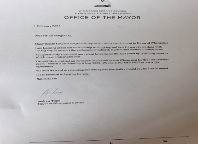 新西兰旺阿诺伊市安德鲁市长感谢丽江市为2022年该市举办灯节提供300个具有丽江特色的灯笼,给活动成功举办添彩,希望邀请丽江市代表团在2023年5月出席该市第二届灯节。