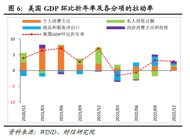 三是经济增长方面,近期美国部分经济指标有所回暖,2023年温和衰退概率偏大。美国2022年四季度GDP环比增速好于预期(见图6),2023年1月份PMI较上月还有所回升,均显示其经济韧性仍强;且从贡献力量看,服务消费和服务业支撑有力是美国经济超预期的重要原因。我们预计受美国劳动力市场依然紧俏,收入降幅有限的影响,占美国GDP比重超7成的消费增速或有“硬底”,2023年美国温和衰退概率偏大(详见报告《2023年宏观经济展望:内需回归,走出荆棘》)。鲍威尔在本次发言中也表示,通胀可以回落到2%,而不会出现真正严重的经济衰退。