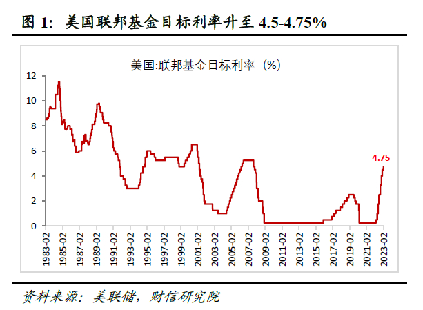 一是加息如期放缓至25BP。美联储2月议息会议决定加息25BP,较去年6-11月份连续四次加息75BP、去年12月份加息50BP,步伐继续有所放缓,符合市场一致预期。本次加息后,联邦基金目标利率升至4.5-4.75%,已接近08年金融危机前的利率高点(见图1)。