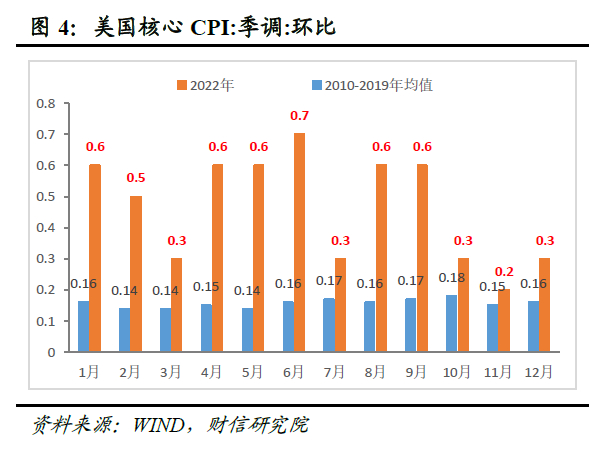 一是美国通胀增速虽已连续多月回落,但劳动力市场紧张,工资-物价螺旋机制作用下,2023年通胀或仍有韧性,通胀水平整体或仍处高位,要求的利率限制性水平更高、持续时间更长。目前美国核心CPI环比增速仍高于历史均值较多(见图4),反映出美国通胀远未恢复常态,仍需高度警惕通胀再次复燃。
