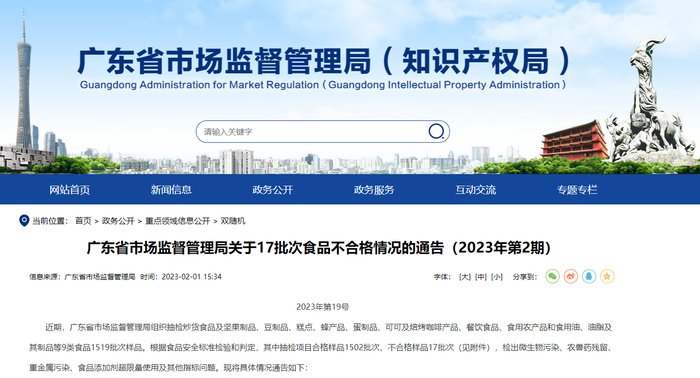 中国质量新闻网讯 据广东省市场监督管理局网站2023年2月1日发布的通告,近期,广东省市场监督管理局组织抽检9类食品1519批次样品。其中,抽检炒货食品及坚果制品样品138批次,根据食品安全标准检验和判定,不合格样品2批次,不合格项目为酸价(以脂肪计)、霉菌。