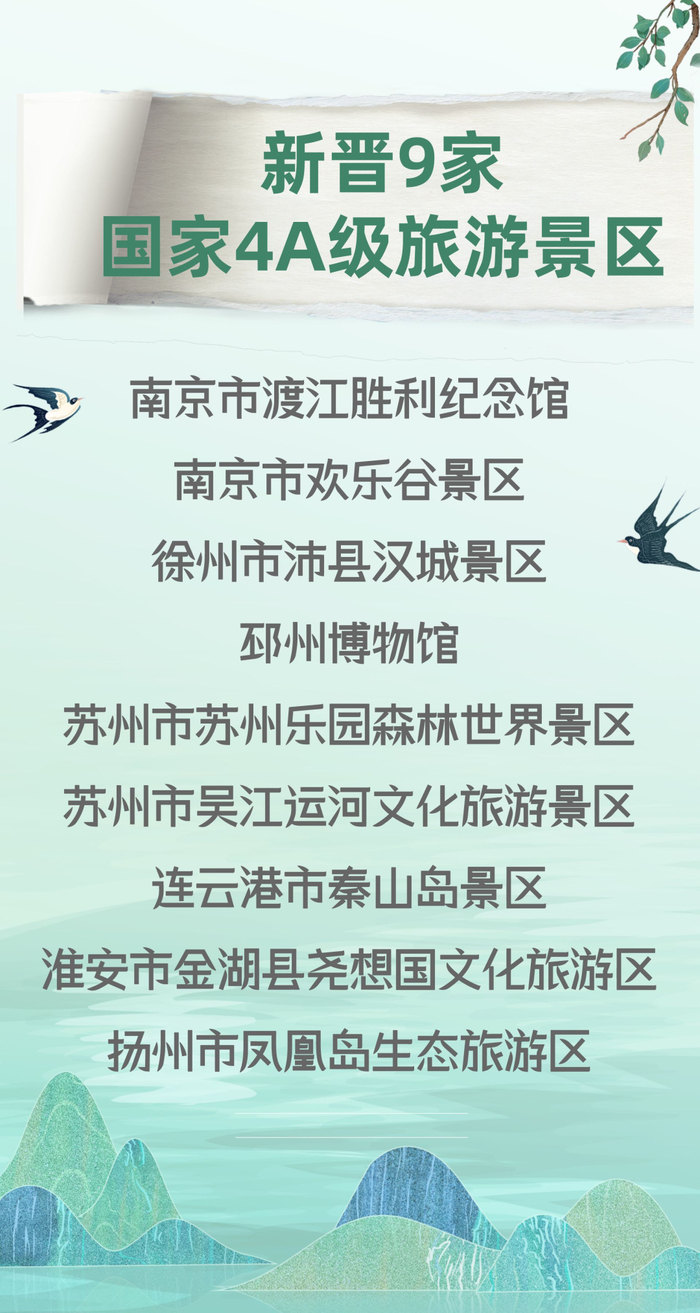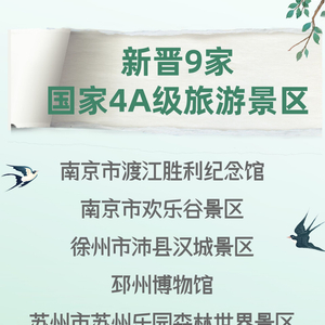 日前,依据《旅游景区质量等级的划分与评定》国家标准和《旅游景区质量等级管理办法》,江苏省文化和旅游厅按程序组织综合评定并完成公示,确定南京市渡江胜利纪念馆等9家旅游景区为国家4A级旅游景区。