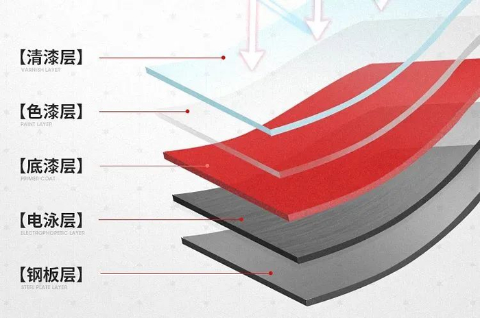 一般来说车漆从低到高分别为底漆(电泳层)、中涂漆、色漆、清漆。