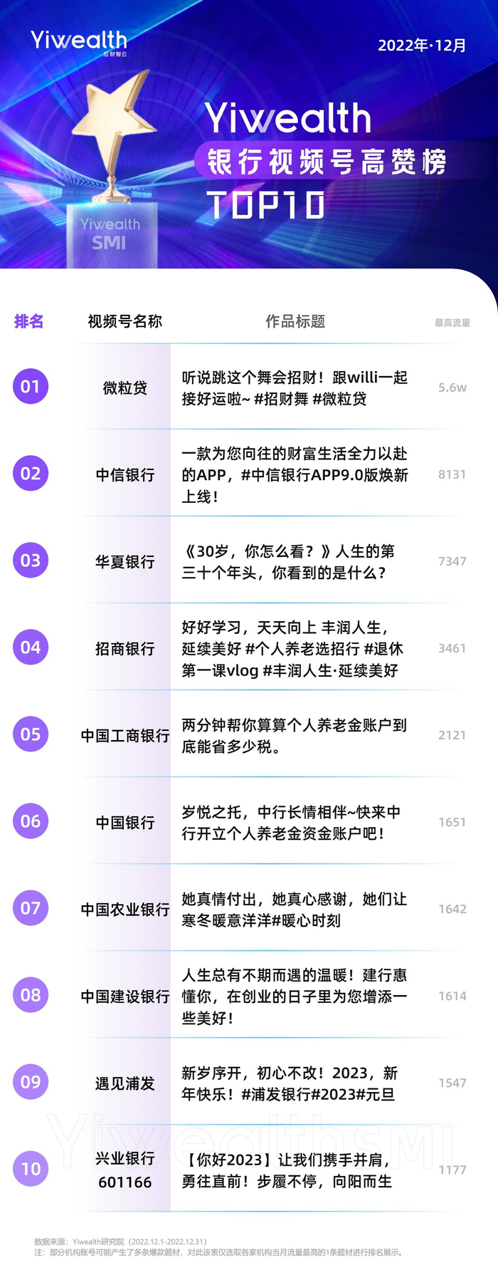 值得注意的是,渤海银行继8月、11月入榜后,12月继续发力并冲入前十,位列第八。据Yiwealth研究院观察,渤海银行自2022年下半年起大力开展“渤学多财”活动,该活动旨在培养青少年财商意识,通过视频号、抖音号多平台发布财商教育动画视频,并在微信小程序内设置动画课程、心愿清单、购物商城等趣味学习场景,号召孩子比拼学习时长、养成储蓄习惯等。