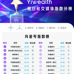 为反映券商、基金、银行、保险等金融机构的社交媒体运营趋势,应帆科技(第一财经控股的混合所有制新生代企业)旗下财富管理信息智慧运营服务商Yiwealth(应财智云)自2022年起每月发布金融机构社交媒体指数(Yiwealth Social Media Index,简称Yiwealth SMI)。