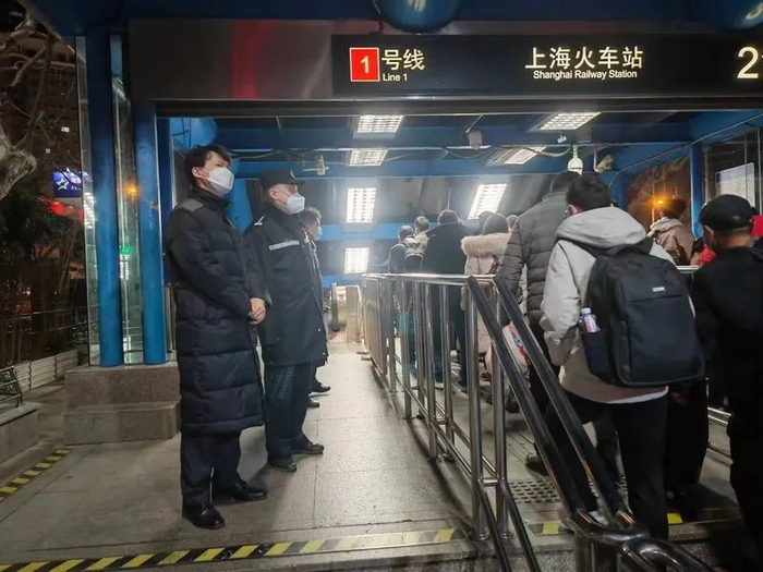 进入轨交区域,提前上岗的轨交民警严阵以待。上海公安轨交总队上海火车站治安派出所综合指挥室警长沈东郓笑称,每年春运自己上的都是“早早班”:“每天4点半不到就要到岗了。4点45分左右,连接上海站南广场的地铁1号线2号进站口的卷帘门就会提前打开,我们要组织滞留旅客在首班车运营前完成安检,有序进入站台等待。”