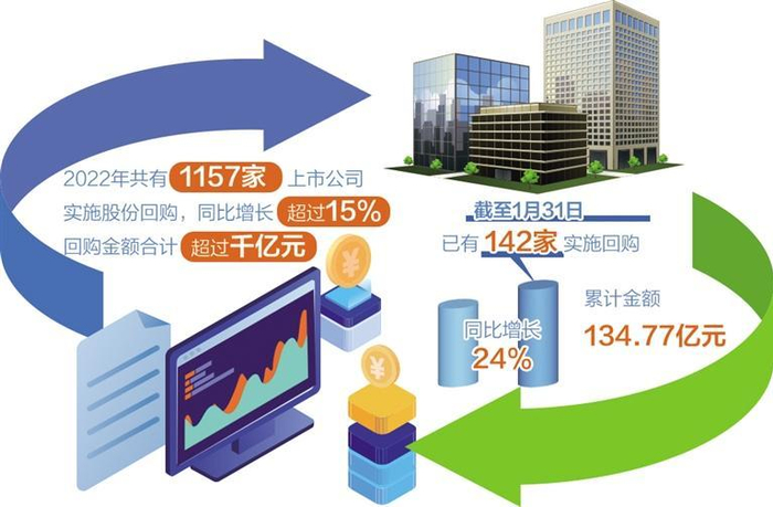 2022年是上市公司实施股份回购的“大年”。Wind数据显示,2022年共有1157家上市公司实施股份回购,同比增长超过15%,创下历年新高,在回购金额上,1157家上市公司合计超过千亿元。今年开年以来,回购依然成为了多家上市公司的共同选择。数据显示,截至1月31日,已有142家实施回购,较去年同期增长24%,金额累计达到134.77亿元。