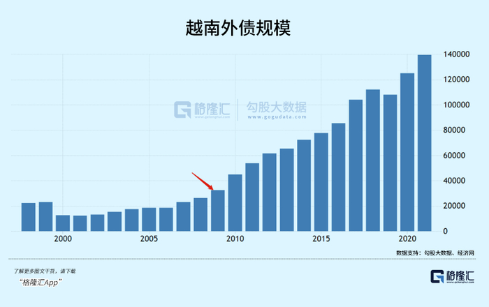 不过,越南始终没有逃脱为外资打工的命运。过去10年,越南依靠生产低附加值的产品,辛辛苦苦多积攒了800亿美元,到2021年末外汇储备累计为1100亿美元(后支撑汇市,目前掉到800多亿)。但外债规模从2010年的400亿美元飙升至2021年的1400亿美元,增幅高达250%。