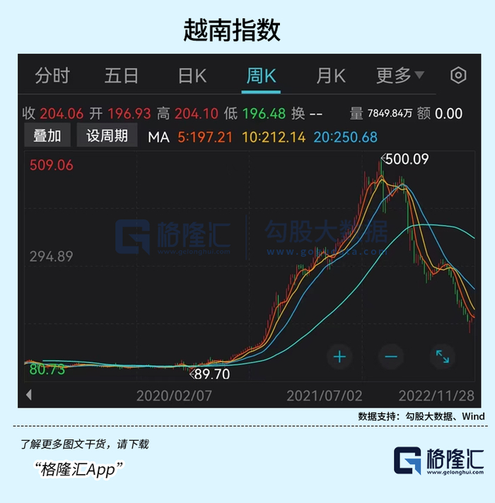 这加剧了越南股市崩盘式暴跌——从500点在短短11个月之内狂泻至最低的168点,最大跌幅为66%。越南另一主流股指——VN30指数也曾一度暴跌近40%。