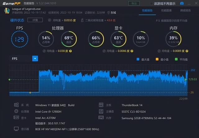 《英雄联盟》大家也都知道,对于显卡要求不高,全程平均帧率129,处理器和显卡负载都很低,很轻松。